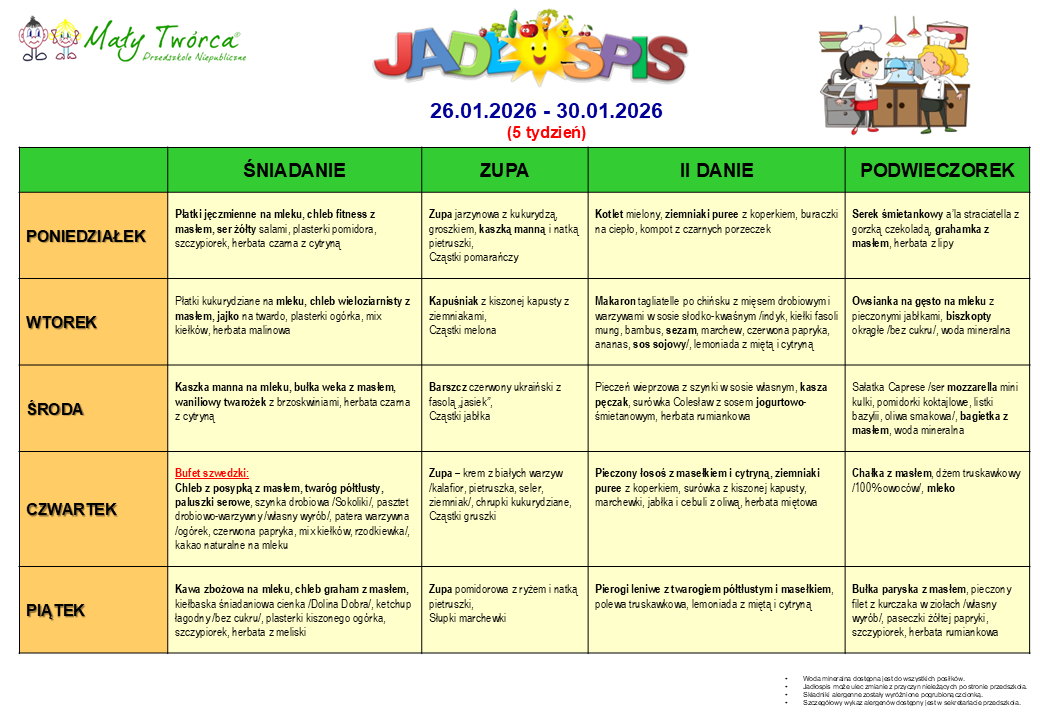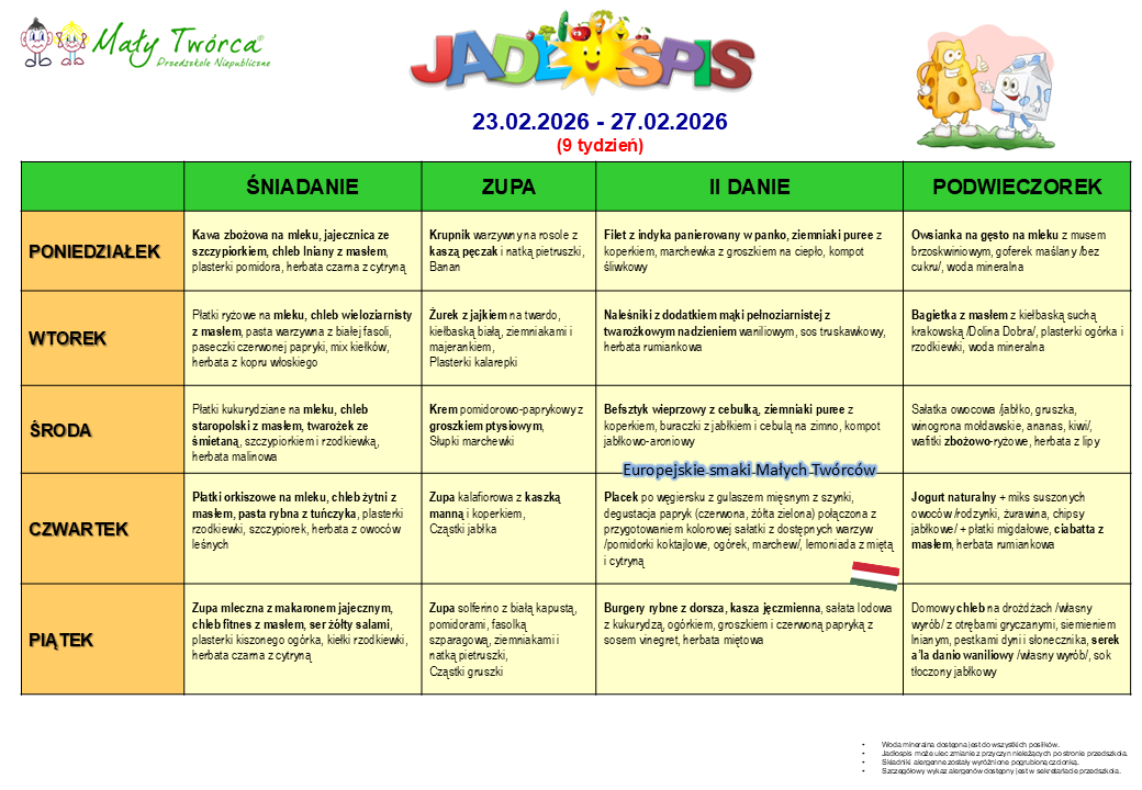 Pliki do pobrania Rozkłada zajęć Grupa 1 Pobierz Grupa 2 Pobierz Grupa 3 Pobierz Grupa 4 Pobierz Grupa 5 Pobierz JADŁOSPIS UMOWA ROK SZKOLNY 2025/2026 STANDARDY OCHRONY MAŁOLETNICH Pobierz Pobierz Pobierz